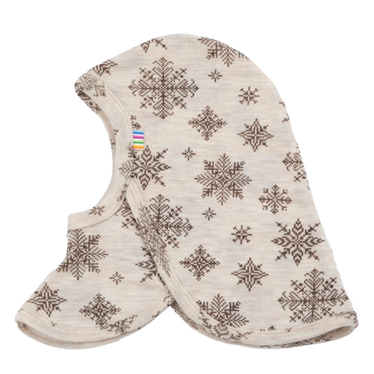 Elefanthue i dobbeltlag i beige med print af snefug I 100% merinould