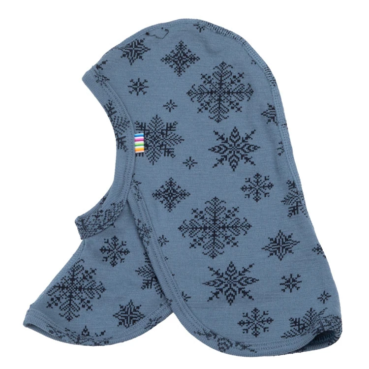 Elefanthue i dobbeltlag i blå med print af snefug I 100% merinould