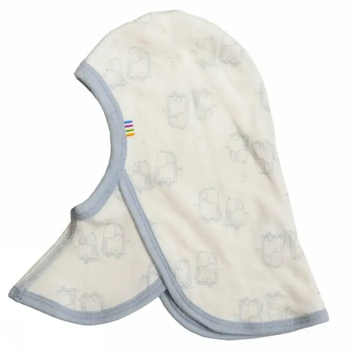 Elefanthue dobbeltlad hvid uld med lyseblå elefantprint