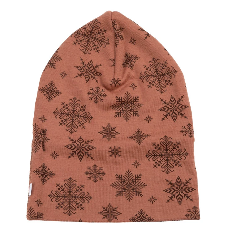 Hue i dobbeltlag i rustfarvet med print af snefug I 100% merinould