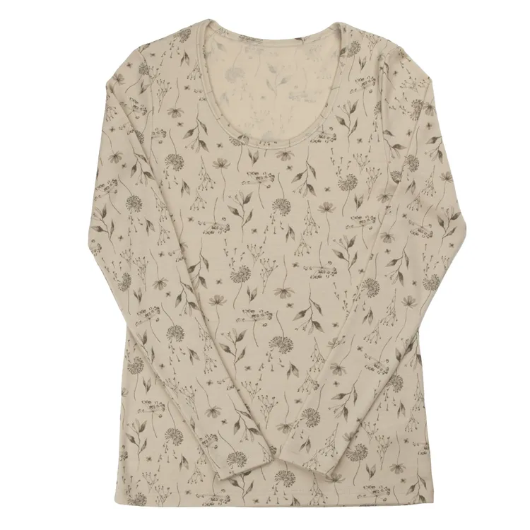 Bluse med lange ærmer i lys beige med mælkebøtteprint i merinould