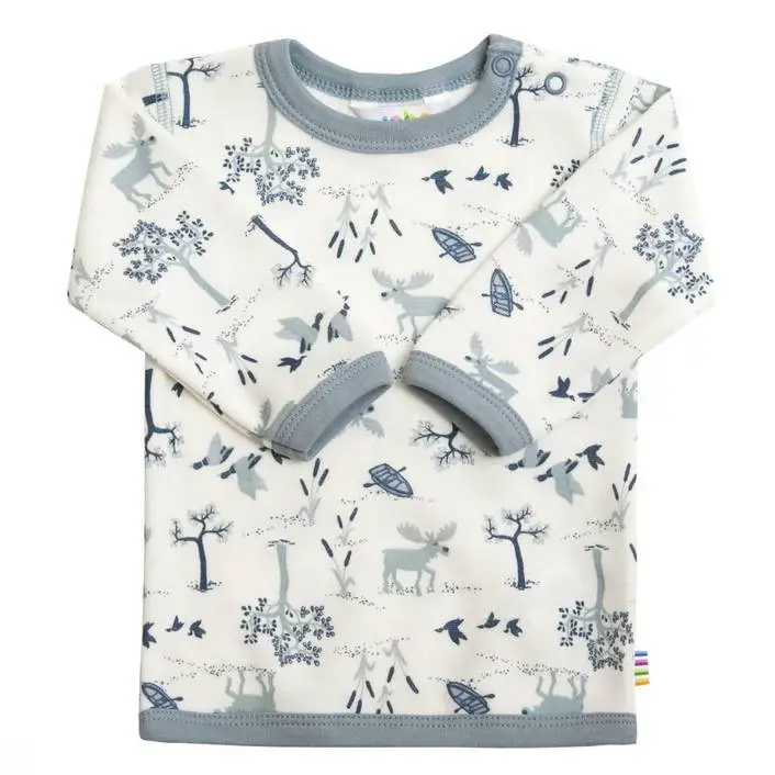 Bluse hvid/lysblå uld-bambus med print