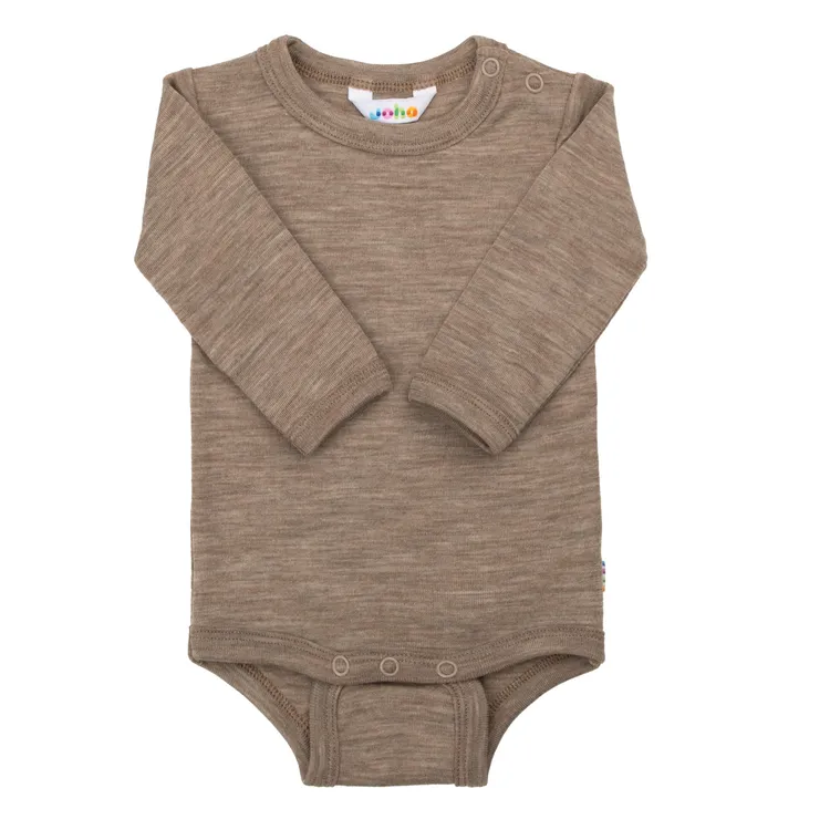 Body med lange ærmer i brunmeleret merinould og silke er lavet af 85% Uld og 15% Silke og i farven Beige Mel.. Vi fører et kæmpe udvalg af JOHA. Følgende størrelser er på lager (50, 60, 70, 80, 90, 100). Du får FRI FRAGT allerede fra 349,- hos Ugleunger når du handler Body lang ærme fra JOHA.
