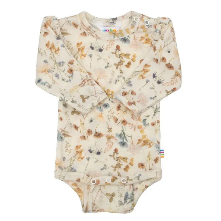 Body med lange ærmer i råhvid merinould med blomsterprint