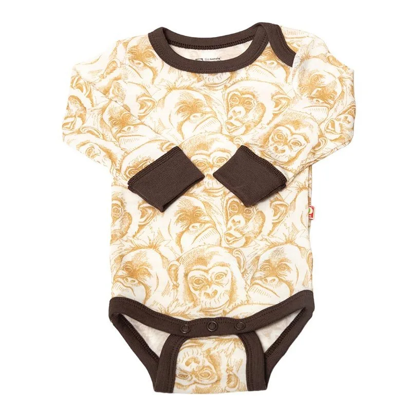 Langærmet body råhvid økologisk uld med chimpanseprint