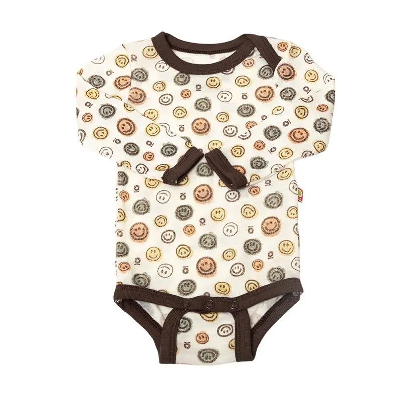 Langærmet body råhvid økologisk uld med brun kant og Emoji print