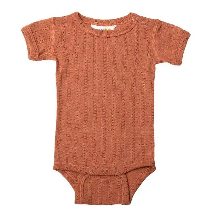 Kortærmet body i orange uld-silke med hulmønster og blondekant