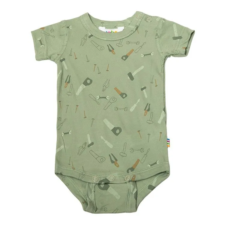 Kortærmet body i grøn økologisk bambus med værktøjsprint