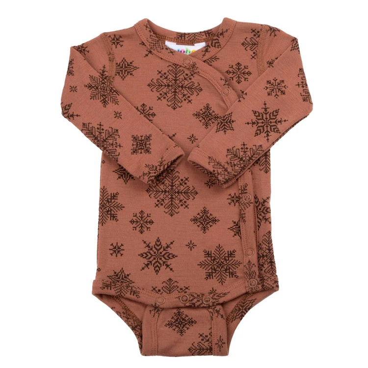 Body med sideluk i rustfarvet med print af snefug I 100% merinould