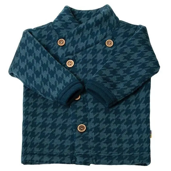 Cardigan i blå vævet merinould med mønster