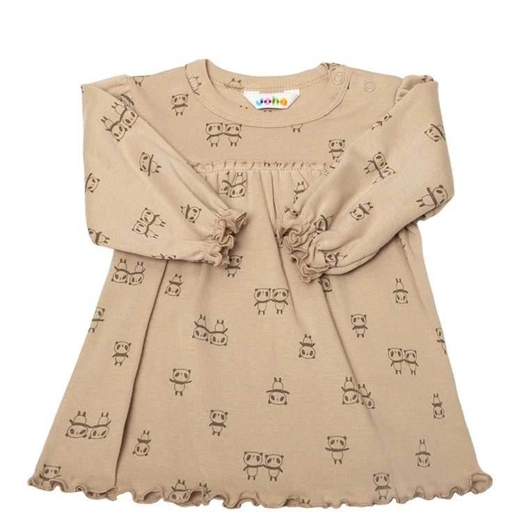 Kjole i flot beige-brun økologisk bomuld med pandaprint
