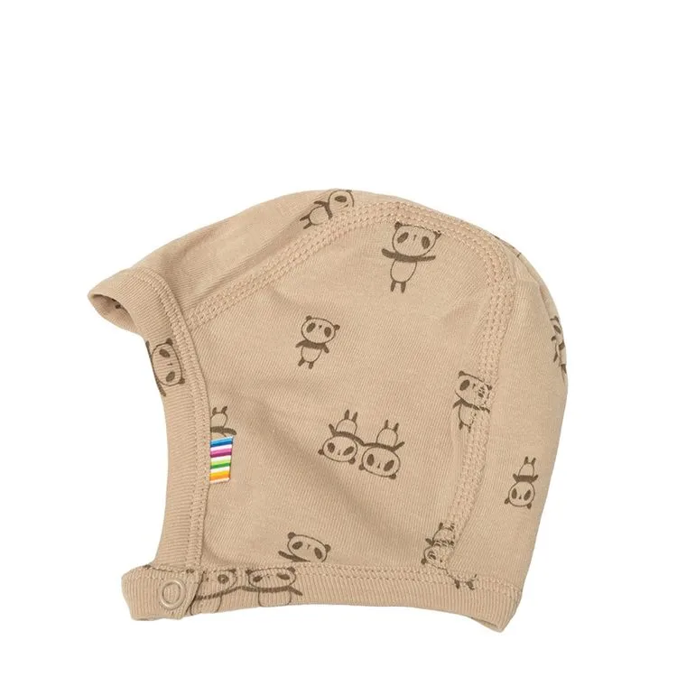 Hjelm i flot beige-brun økologisk bomuld med pandaprint