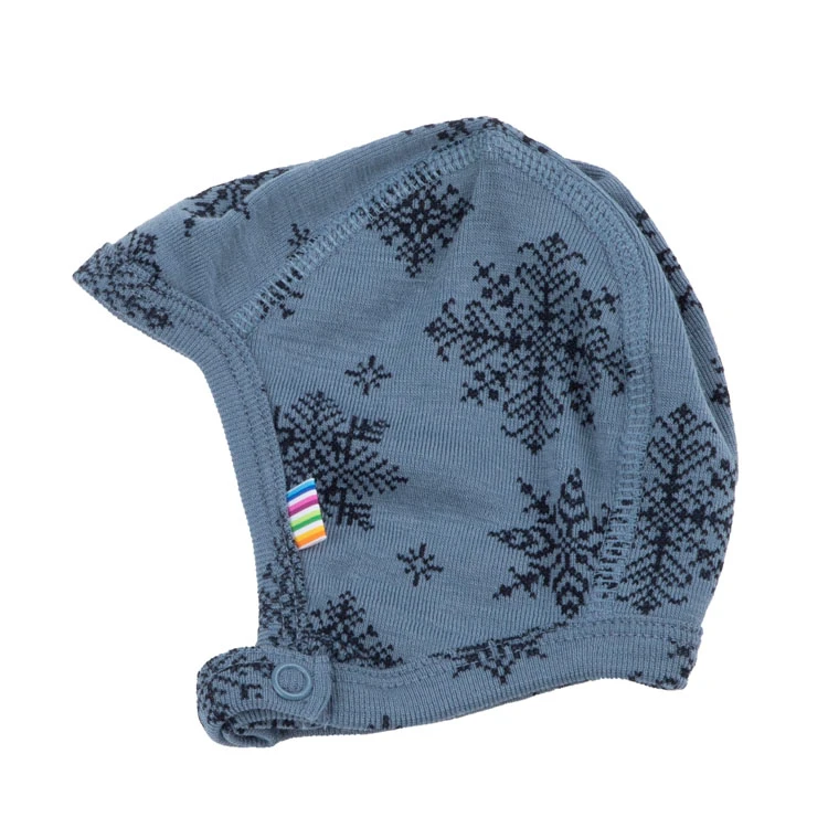 Hjelm i enkeltlag i blå med print af snefug I 100% merinould