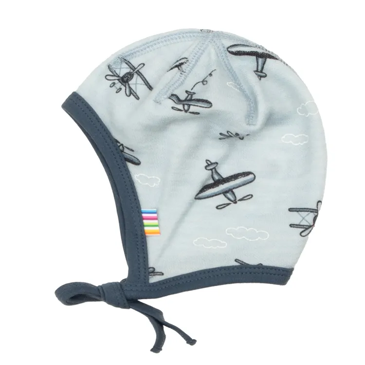 Hjelm med knapper i enkeltlags støvet blå uld/bambusblanding med gåse- og propelmotiv