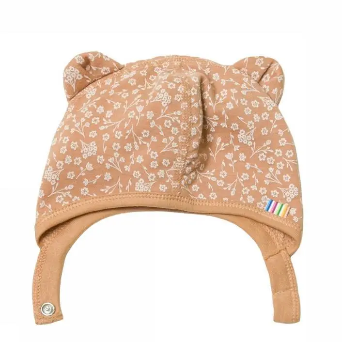 Hjelm i brun uld og økologisk bomuld med blomster print