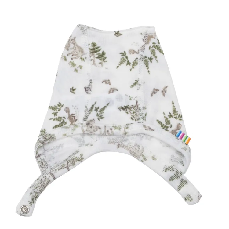 Hjelm med knapper i enkeltlags grønmeleret uld og silke med naturmotiv