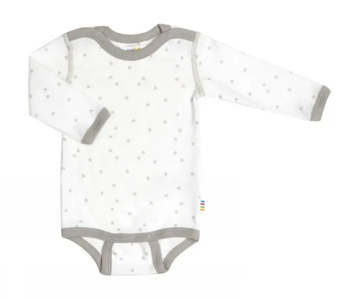 Skøn langærmet bodystocking med fint stjerneprint. Pasformen er slank og langs alle kanter er påsyet forstærket rib. Bodyen lukkes med trykknapper omkring halsåbning og bund.