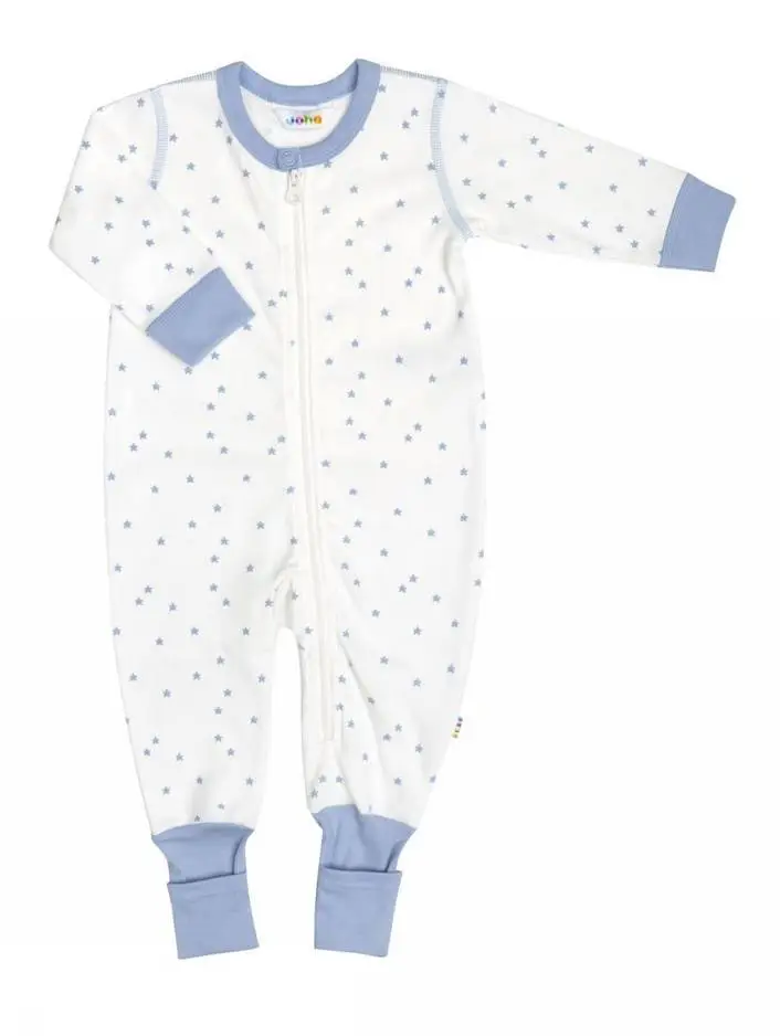 Skøn lyseblå heldragt i økologisk bomuld fra Joha´s nye 2017 sommerkollektion. Heldragten er designet med et fint stjernemønster, god pasform og lynlås ned langs mave og ben. Altså er både udseende og funktionalitet i top på denne model. Den brede rib omkring anklen kan endvidere bukkes om til en integreret fod.