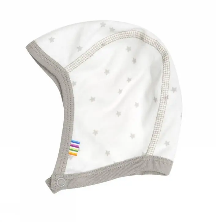 Fin lille hjelm i tynd bomuld. Hjelmen er hvid med brun kant. Den brune hjem er rundsyet og lukkes under hagen med en lille trykknap. Ribkanten langs hjelmens åbning sikrer, at barnets ører ikke udsættes for træk.
