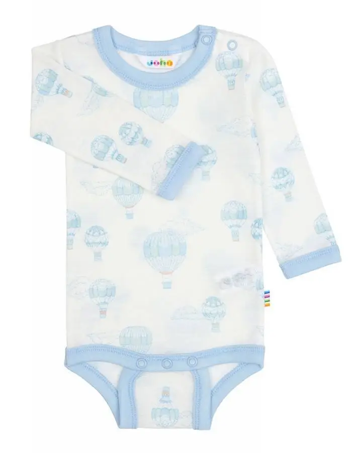 Hvid langærmet body med små lyseblå luftballoner i sommeruld