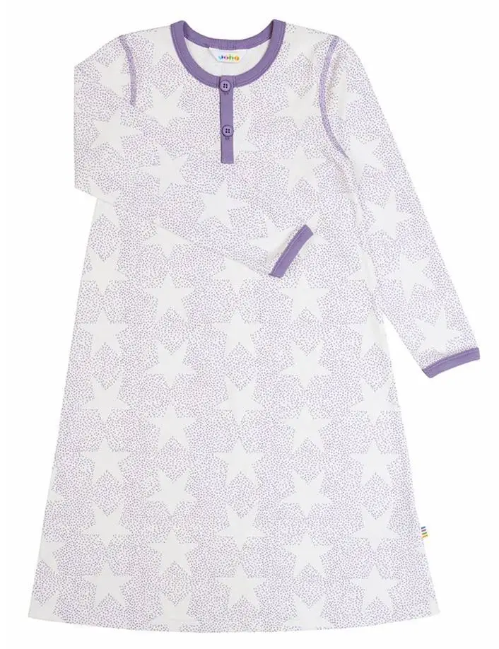 Hvid natkjole med stjerne og lilla kant er lavet af 96% Økologisk bomuld og 4% lycra og i farven Stars&Spot. Vi fører et kæmpe udvalg af JOHA. Følgende størrelser er på lager (). Du får FRI FRAGT allerede fra 349,- hos Ugleunger når du handler Natkjole fra Joha