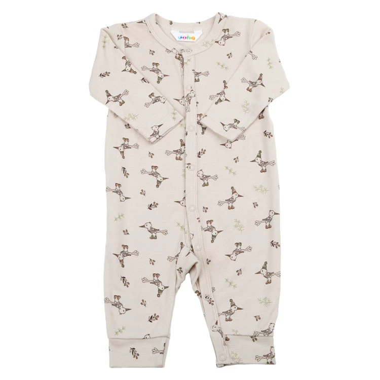 Heldragt i beige med fugleprint i økologisk bomuld