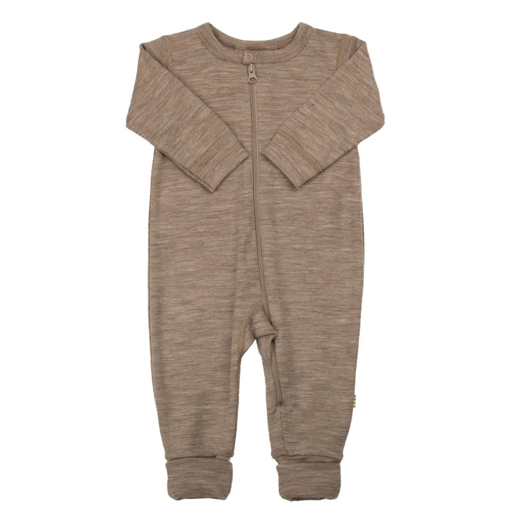 Heldragt med 2-i-1 fod i brunmeleret merinould og silke