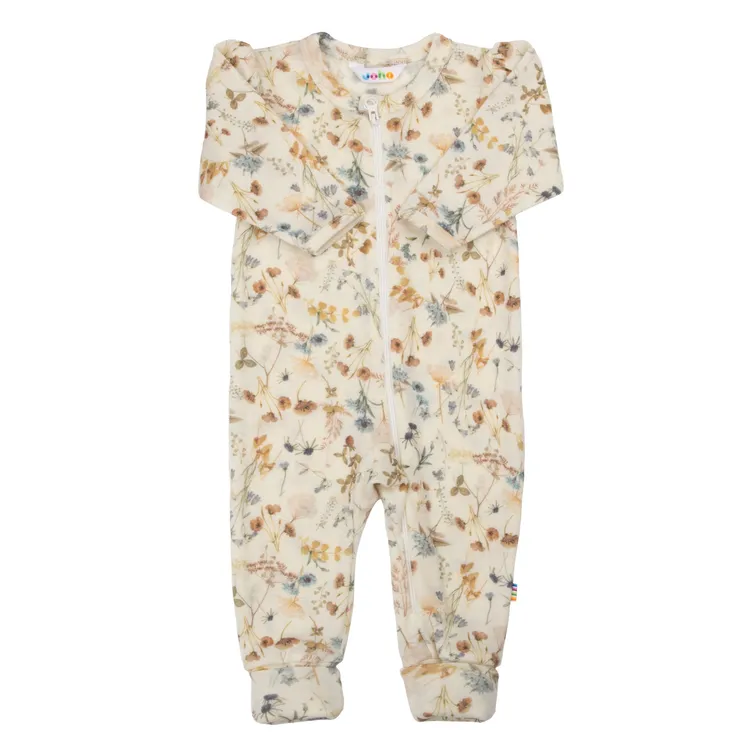 Heldragt med 2-i-1 fod i råhvid merinould med blomsterprint