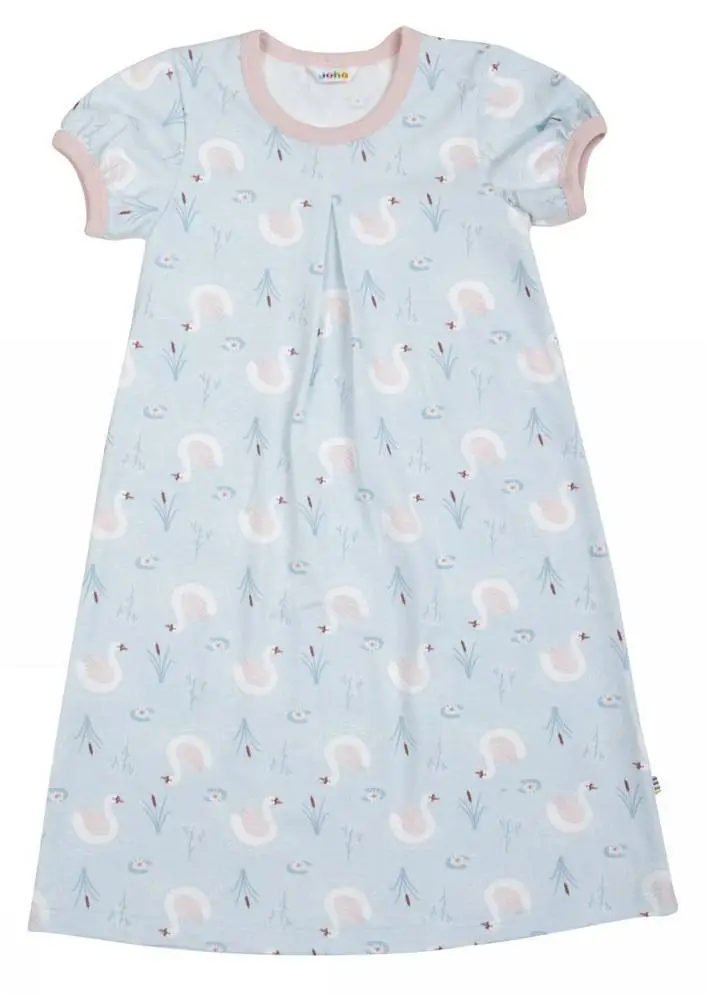 Blød og fin natkjole fra Joha i økologisk bomuld. Natkjolen er med fineste prints af svaner og en flot rosa kant ved hænderne og rundt i halsen. Samme farve går igen inde ved svanerne. Den lyseblå natkjole er en anelse bred for neden, hvilket giver det feminine udtryk og er ret lang og går ned over numsen. Fint snit ved hals giver v-formen hele vejen ned midtfor.