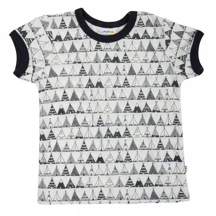 T-shirt i dejlig uld-silke og med hvid grundfarve og med mørkeblå telte i mønsteret. T-shirten er med elastik ved hals, så den nemt tages af og på. Den tynde uld-silke sikrer T-shirten følger kroppens former når den bæres. Den tynde uld-silke gør den mest anvendelig i de varmere måneder på året.