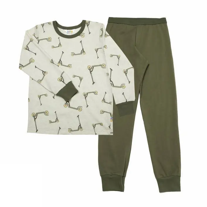 Pyjamas grøn økologisk bomuld med løbehjulsprint er lavet af 96% Økologisk bomuld og 4% lycra og i farven Oliven AOP. Vi fører et kæmpe udvalg af JOHA. Følgende størrelser er på lager (). Du får FRI FRAGT allerede fra 349,- hos Ugleunger når du handler Pyjamas fra Joha