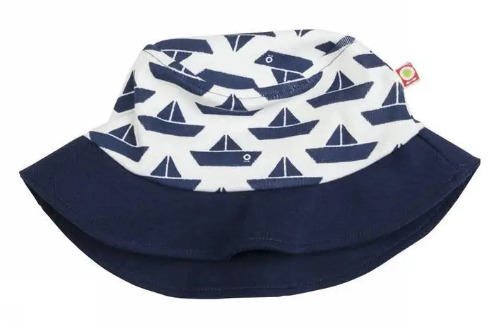 Solhat blå og hvid med papirbåd-print økologisk bomuld