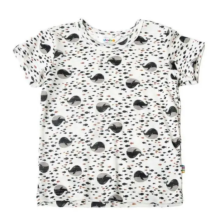 T-shirt hvid og mørkeblå uld-silke med hvalprint