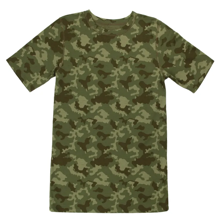 T-shirt i grøn camouflage med camouflageprint i merinould