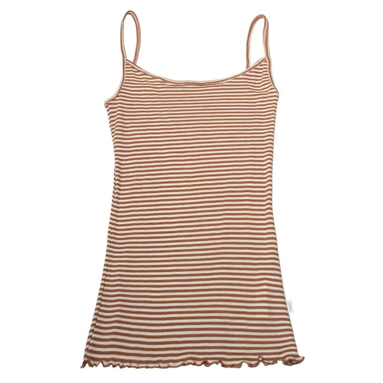 Top i orange-brun og hvidstribet uld-silke fra Joha Dame