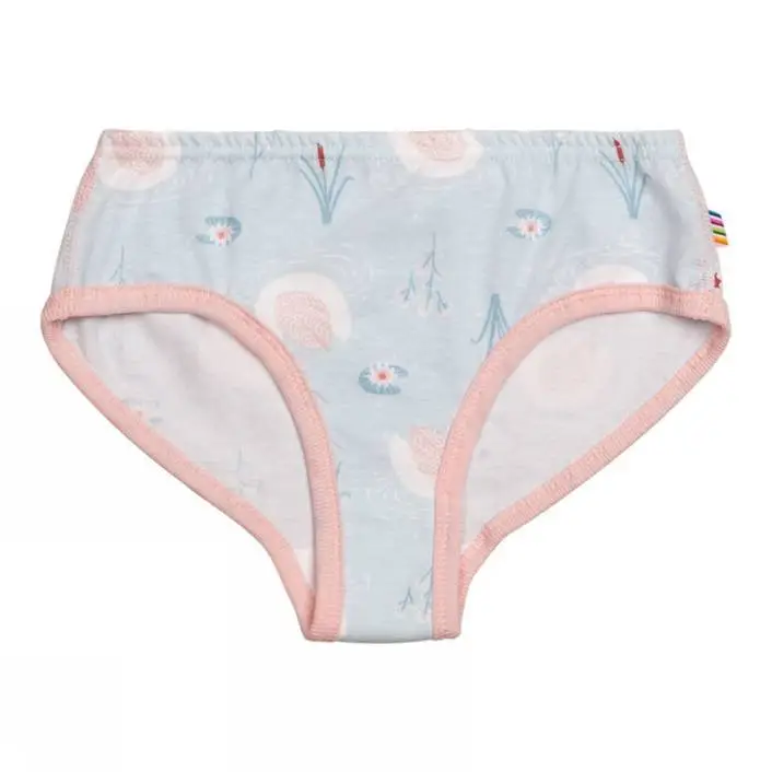 Underbukser fra Joha i virkelig fin lys blå med de sødeste svaner i printet og en fin rosa kant rundt ved lårerne. Underbukserne er klassiske i formen, lukker ned om ballen og har almindelig elastik ved livet. De er lavet i økologisk bomuld og er dejlig bløde.