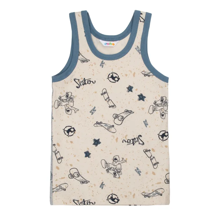 Undertrøje i lys beige med skateprint og blå rib i økologisk bomuld