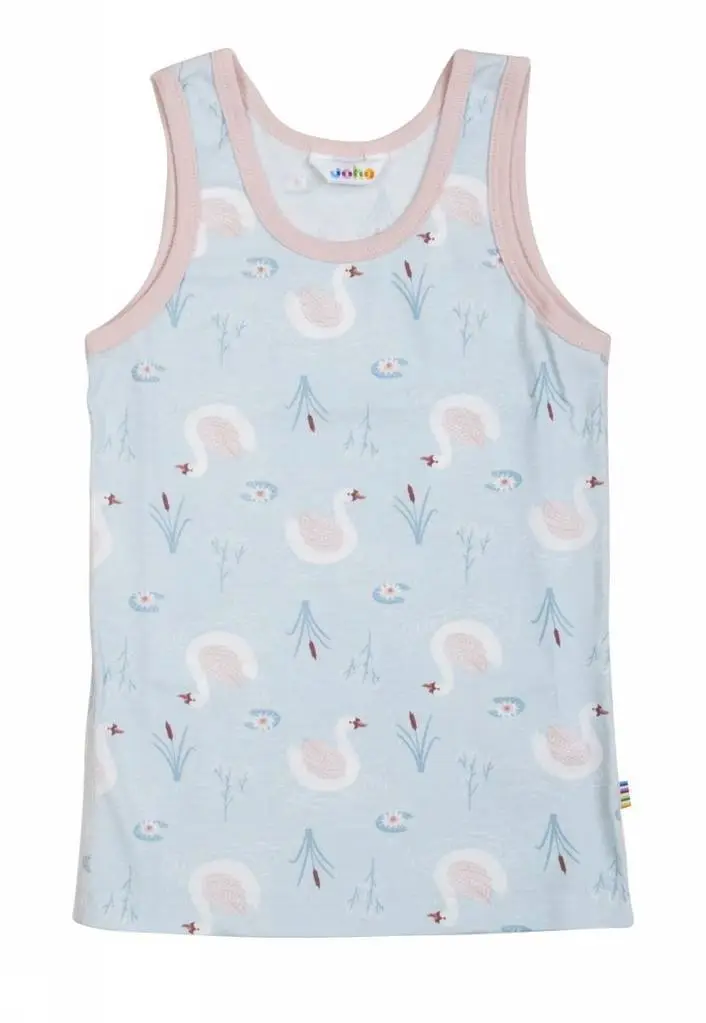 Flot og fin undertrøje i lys blå med rosa kant ved hals og ærmerne. Den er med de sødeste print af svaner inde i stoffet, som giver et så fint udtryk. Hele serien med de her svaner er fra Joha forår/sommer 2019 kollektion og er i økologisk bomuld.